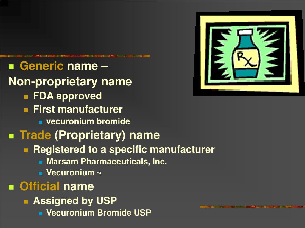 Genericname – Non-proprietary name • FDA approved • First manufacturer • vecuronium bromide • Trade (Proprietary) name • Registered to a specific manufacturer • Marsam Pharmaceuticals, Inc. • Vecuronium TM • Officialname • Assigned by USP • Vecuronium Bromide USP