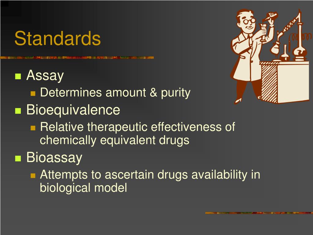 Standards • Assay • Determines amount & purity • Bioequivalence • Relative therapeutic effectiveness of chemically equivalent drugs • Bioassay • Attempts to ascertain drugs availability in biological model