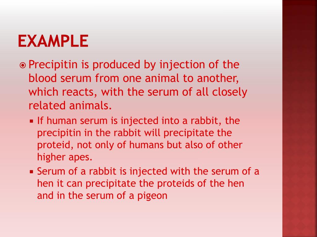 Example • Precipitin is produced by injection of the blood serum from one animal to another, which reacts, with the serum of all closely related animals. • If human serum is injected into a rabbit, the precipitin in the rabbit will precipitate the proteid, not only of humans but also of other higher apes. • Serum of a rabbit is injected with the serum of a hen it can precipitate the proteids of the hen and in the serum of a pigeon