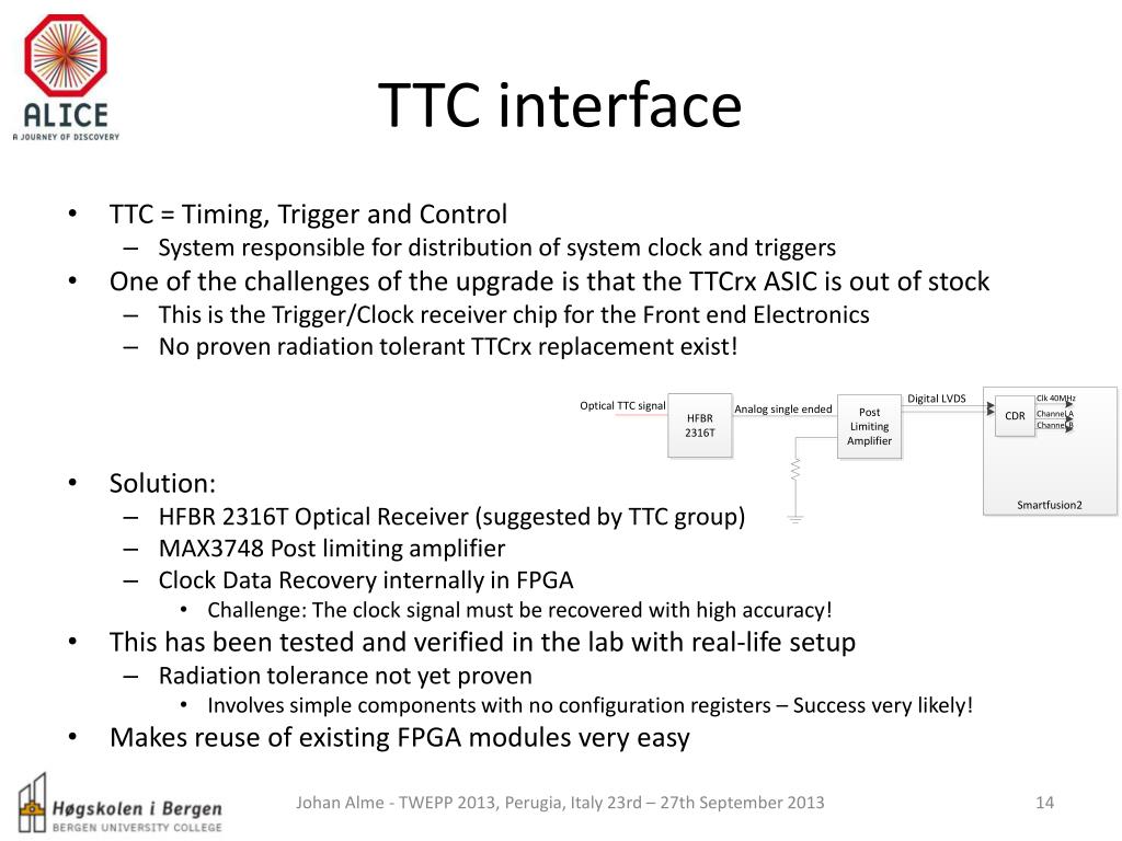 TTC interface • TTC = Timing, Trigger and Control • System responsible for distributionof system clock and triggers • One ofthechallengesoftheupgrade is thattheTTCrx ASIC is outofstock • This is theTrigger/Clockreceiver chip for the Front end Electronics • No provenradiation tolerant TTCrxreplacementexist! • Solution: • HFBR 2316T OpticalReceiver (suggested by TTC group) • MAX3748 Post limitingamplifier • Clock Data Recoveryinternally in FPGA • Challenge: The clock signal must be recoveredwithhighaccuracy! • This has beentested and verified in the lab withreal-lifesetup • Radiationtolerance not yetproven • Involves simple componentswithnoconfiguration registers – Successverylikely! • Makes reuseofexisting FPGA modulesveryeasy Johan Alme - TWEPP 2013, Perugia, Italy 23rd – 27th September 2013