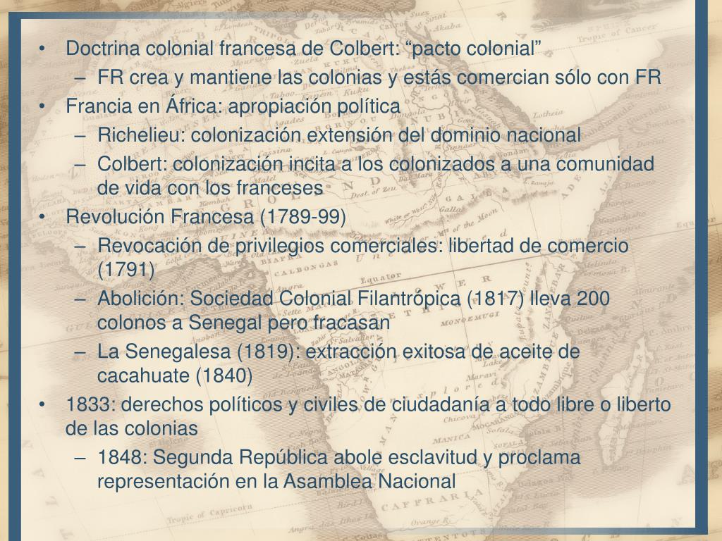 Doctrina colonial francesa de Colbert: “pacto colonial” • FR crea y mantiene las colonias y estás comercian sólo con FR • Francia en África: apropiación política • Richelieu: colonización extensión del dominio nacional • Colbert: colonización incita a los colonizados a una comunidad de vida con los franceses • Revolución Francesa (1789-99) • Revocación de privilegios comerciales: libertad de comercio (1791) • Abolición: Sociedad Colonial Filantrópica (1817) lleva 200 colonos a Senegal pero fracasan • La Senegalesa (1819): extracción exitosa de aceite de cacahuate (1840) • 1833: derechos políticos y civiles de ciudadanía a todo libre o liberto de las colonias • 1848: Segunda República abole esclavitud y proclama representación en la Asamblea Nacional