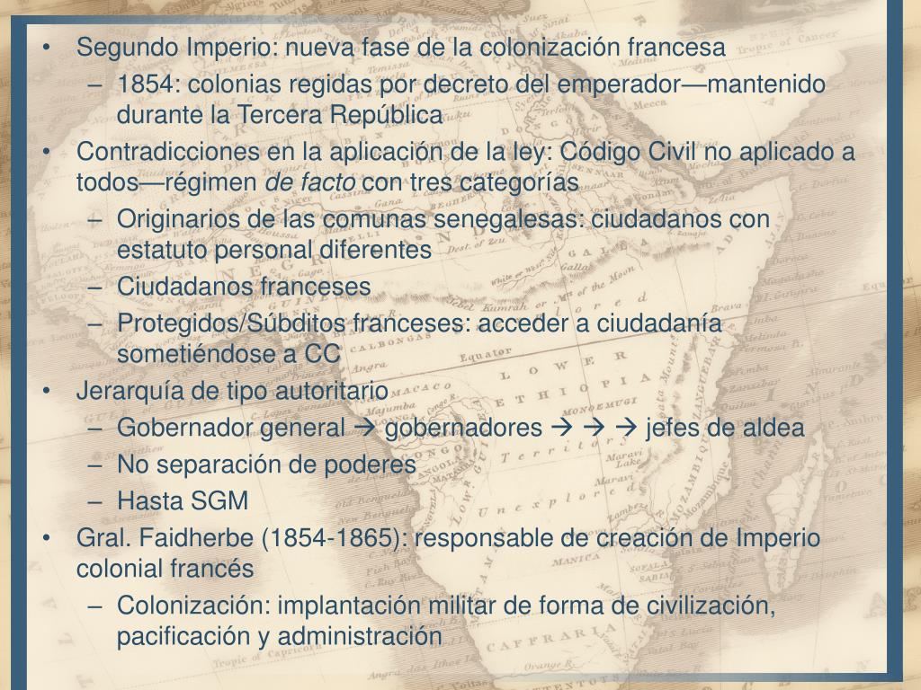 Segundo Imperio: nueva fase de la colonización francesa • 1854: colonias regidas por decreto del emperador—mantenido durante la Tercera República • Contradicciones en la aplicación de la ley: Código Civil no aplicado a todos—régimen de facto con tres categorías • Originarios de las comunas senegalesas: ciudadanos con estatuto personal diferentes • Ciudadanos franceses • Protegidos/Súbditos franceses: acceder a ciudadanía sometiéndose a CC • Jerarquía de tipo autoritario • Gobernador general gobernadores jefes de aldea • No separación de poderes • Hasta SGM • Gral. Faidherbe (1854-1865): responsable de creación de Imperio colonial francés • Colonización: implantación militar de forma de civilización, pacificación y administración