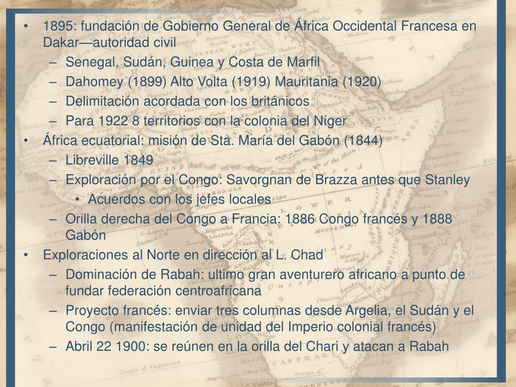 1895: fundación de Gobierno General de África Occidental Francesa en Dakar—autoridad civil • Senegal, Sudán, Guinea y Costa de Marfil • Dahomey (1899) Alto Volta (1919) Mauritania (1920) • Delimitación acordada con los británicos • Para 1922 8 territorios con la colonia del Níger • África ecuatorial: misión de Sta. María del Gabón (1844) • Libreville 1849 • Exploración por el Congo: Savorgnan de Brazza antes que Stanley • Acuerdos con los jefes locales • Orilla derecha del Congo a Francia: 1886 Congo francés y 1888 Gabón • Exploraciones al Norte en dirección al L. Chad • Dominación de Rabah: ultimo gran aventurero africano a punto de fundar federación centroafricana • Proyecto francés: enviar tres columnas desde Argelia, el Sudán y el Congo (manifestación de unidad del Imperio colonial francés) • Abril 22 1900: se reúnen en la orilla del Chari y atacan a Rabah