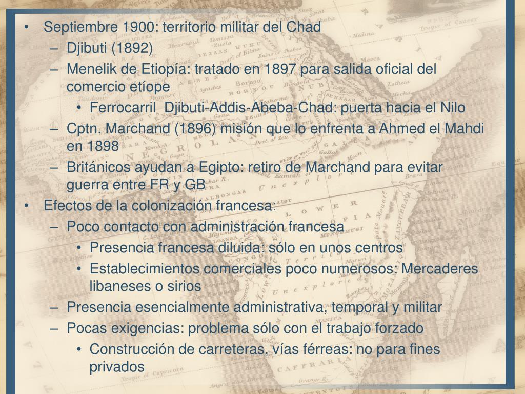 Septiembre 1900: territorio militar del Chad • Djibuti (1892) • Menelik de Etiopía: tratado en 1897 para salida oficial del comercio etíope • Ferrocarril Djibuti-Addis-Abeba-Chad: puerta hacia el Nilo • Cptn. Marchand (1896) misión que lo enfrenta a Ahmed el Mahdi en 1898 • Británicos ayudan a Egipto: retiro de Marchand para evitar guerra entre FR y GB • Efectos de la colonización francesa: • Poco contacto con administración francesa • Presencia francesa diluida: sólo en unos centros • Establecimientos comerciales poco numerosos: Mercaderes libaneses o sirios • Presencia esencialmente administrativa, temporal y militar • Pocas exigencias: problema sólo con el trabajo forzado • Construcción de carreteras, vías férreas: no para fines privados
