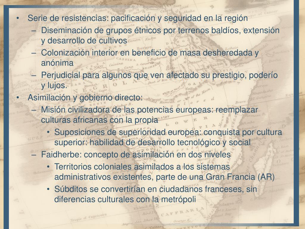 Serie de resistencias: pacificación y seguridad en la región • Diseminación de grupos étnicos por terrenos baldíos, extensión y desarrollo de cultivos • Colonización interior en beneficio de masa desheredada y anónima • Perjudicial para algunos que ven afectado su prestigio, poderío y lujos. • Asimilación y gobierno directo: • Misión civilizadora de las potencias europeas: reemplazar culturas africanas con la propia • Suposiciones de superioridad europea: conquista por cultura superior: habilidad de desarrollo tecnológico y social • Faidherbe: concepto de asimilación en dos niveles • Territorios coloniales asimilados a los sistemas administrativos existentes, parte de una Gran Francia (AR) • Súbditos se convertirían en ciudadanos franceses, sin diferencias culturales con la metrópoli