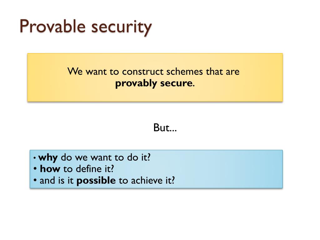 Provable security But... We want to construct schemes that are provably secure. • why do we want to do it? • howto define it? • and is it possibleto achieve it?