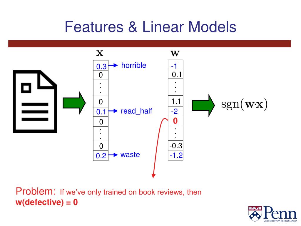 Features & Linear Models horrible -1 0.3 0.1 0 . . . . . . 1.1 0 read_half -2 0.1 0 0 0 . . . . . . -0.3 0 waste -1.2 0.2 Problem: If we’ve only trained on book reviews, then w(defective) = 0