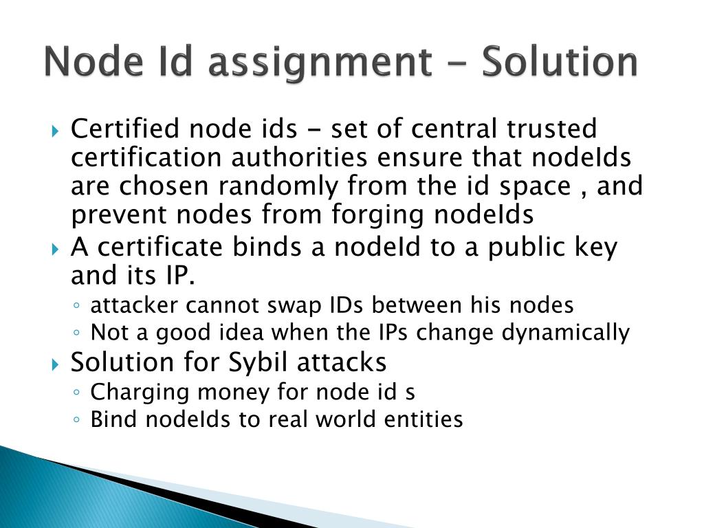 Node Id assignment - Solution • Certified node ids - set of central trusted certification authorities ensure that nodeIds are chosen randomly from the id space , and prevent nodes from forging nodeIds • A certificate binds a nodeId to a public key and its IP. • attacker cannot swap IDs between his nodes • Not a good idea when the IPs change dynamically • Solution for Sybil attacks • Charging money for node id s • Bind nodeIds to real world entities