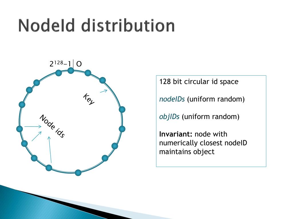NodeId distribution 2128-1 O 128 bit circular id space nodeIDs(uniform random) objIDs (uniform random) Invariant: node with numerically closest nodeID maintains object Key Node ids