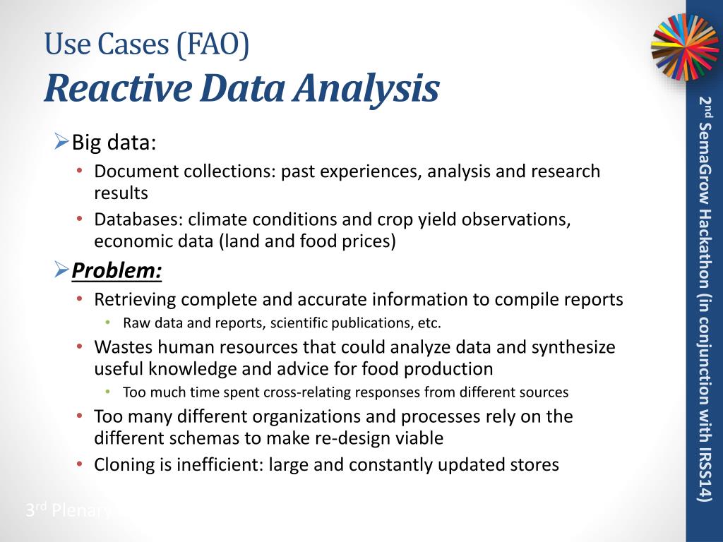 Use Cases (FAO)Reactive Data Analysis • Big data: • Document collections: past experiences, analysis and research results • Databases: climate conditions and crop yield observations, economic data (land and food prices) • Problem: • Retrieving complete and accurate information to compile reports • Raw data and reports, scientific publications, etc. • Wastes human resources that could analyze data and synthesize useful knowledge and advice for food production • Too much time spent cross-relating responses from different sources • Too many different organizations and processes rely on the different schemas to make re-design viable • Cloning is inefficient: large and constantly updated stores 2nd SemaGrow Hackathon (in conjunction with IRSS14) 3rd Plenary & ESG Meeting