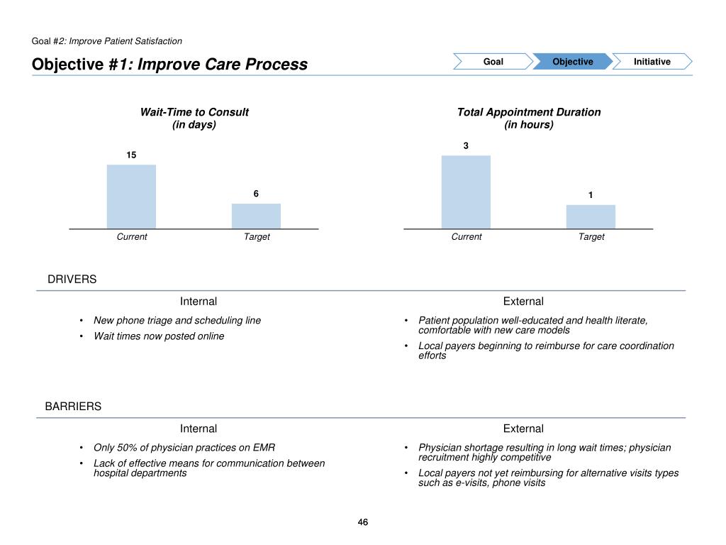 Goal #1: Grow Volume Objective #1: E.g., Increase Market Share by % Goal Objective Initiative DRIVERS Internal External • Strong referral protocols from employed physician practices • Substantial marketing and advertising budget • Competitor closing down facilities, scaling back on service offerings • Currently unmet demand within the market BARRIERS External Internal • Lack of capacity in region 3 • EMR integration behind that of competitors • Competitor employing significant numbers of new physicians