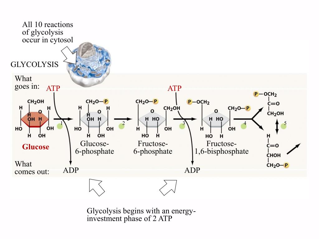 All 10 reactions of glycolysis occur in cytosol GLYCOLYSIS What goes in: ATP ATP 1 2 3 4 5 Glucose- 6-phosphate Fructose- 6-phosphate Fructose- 1,6-bisphosphate Glucose What comes out: ADP ADP Glycolysis begins with an energy-investment phase of 2 ATP