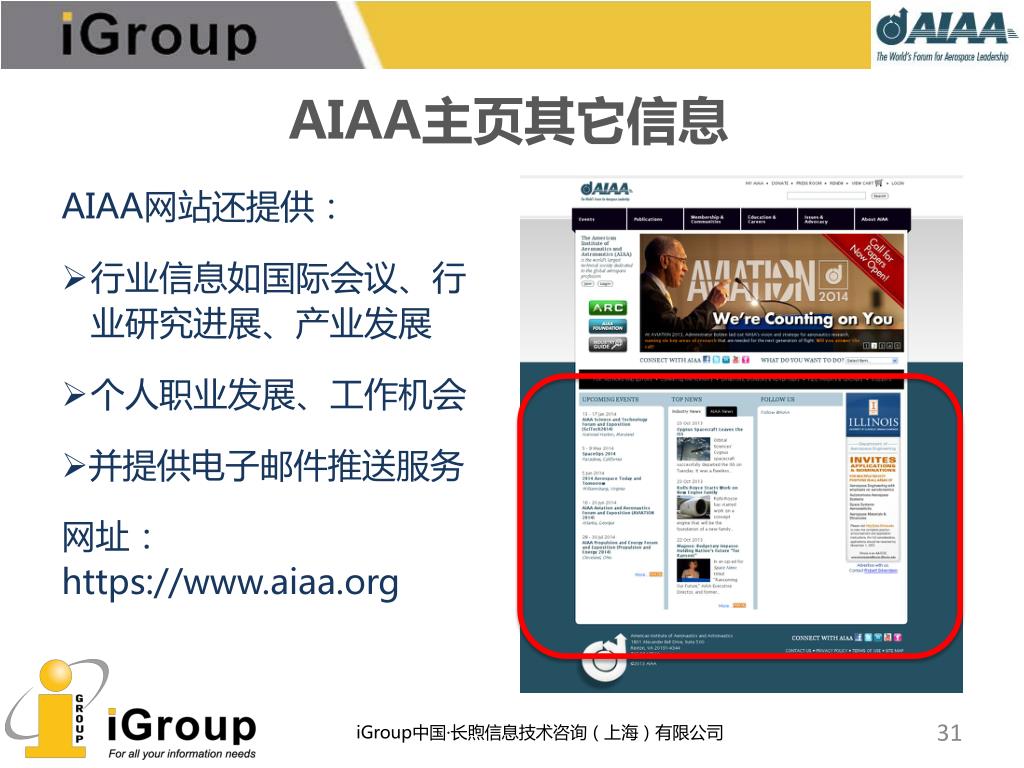 AIAA主页其它信息 AIAA网站还提供: • 行业信息如国际会议、行业研究进展、产业发展 • 个人职业发展、工作机会 • 并提供电子邮件推送服务 网址:https://www.aiaa.org iGroup中国·长煦信息技术咨询(上海)有限公司