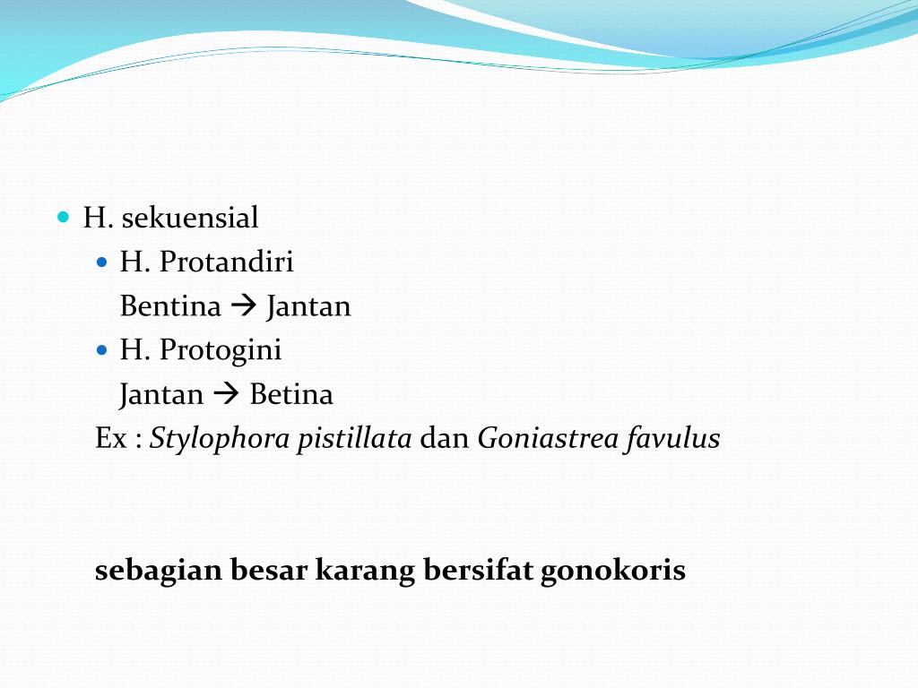 H. sekuensial • H. Protandiri Bentina Jantan • H. Protogini Jantan Betina Ex : StylophorapistillatadanGoniastreafavulus sebagianbesarkarangbersifatgonokoris