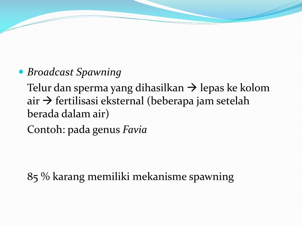 Broadcast Spawning Telurdansperma yang dihasilkan lepaskekolomair fertilisasieksternal (beberapa jam setelahberadadalam air) Contoh: pada genus Favia 85 % karangmemilikimekanisme spawning