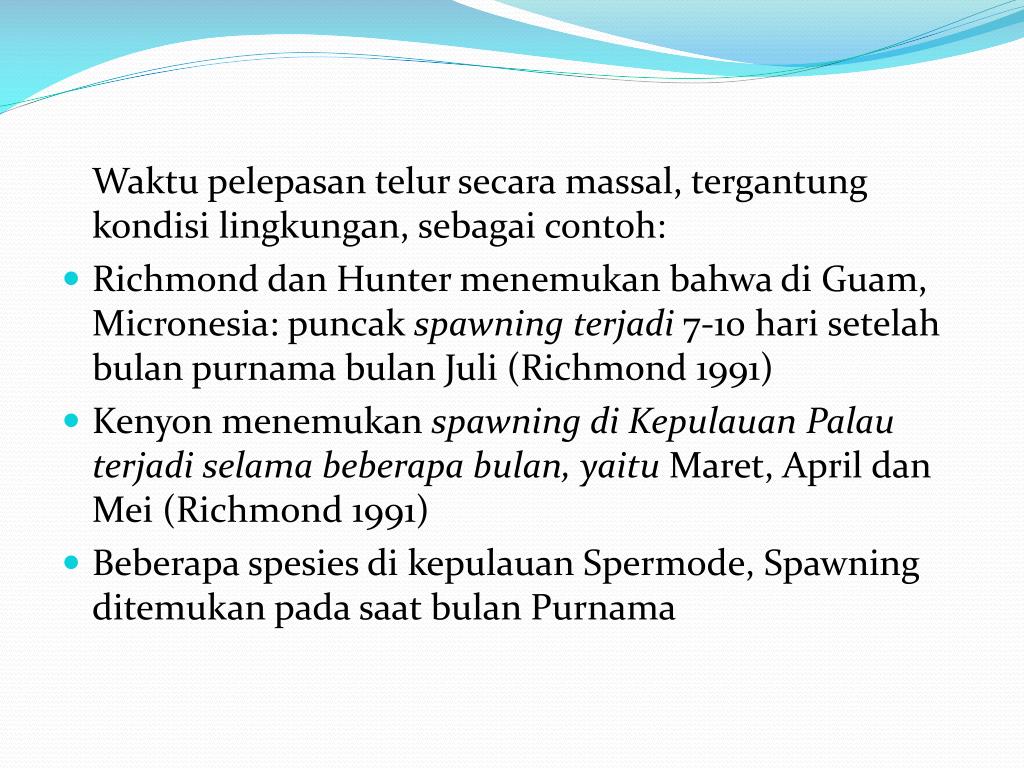 WaktuReproduksi • Umumnyaterjadipadasaatmataharisudahterbenam ex : Platygyrasinensis 3 jam 40 menitsetelahmataharitebenam (Babcock et al., 1989) • Umumnyasetelahmalamke 3 – 6 setelahbulanpurnama ex : kebanyakankarangdi GBR (Acroporalatistella) • Umumnyaterjadipadamusimpanas