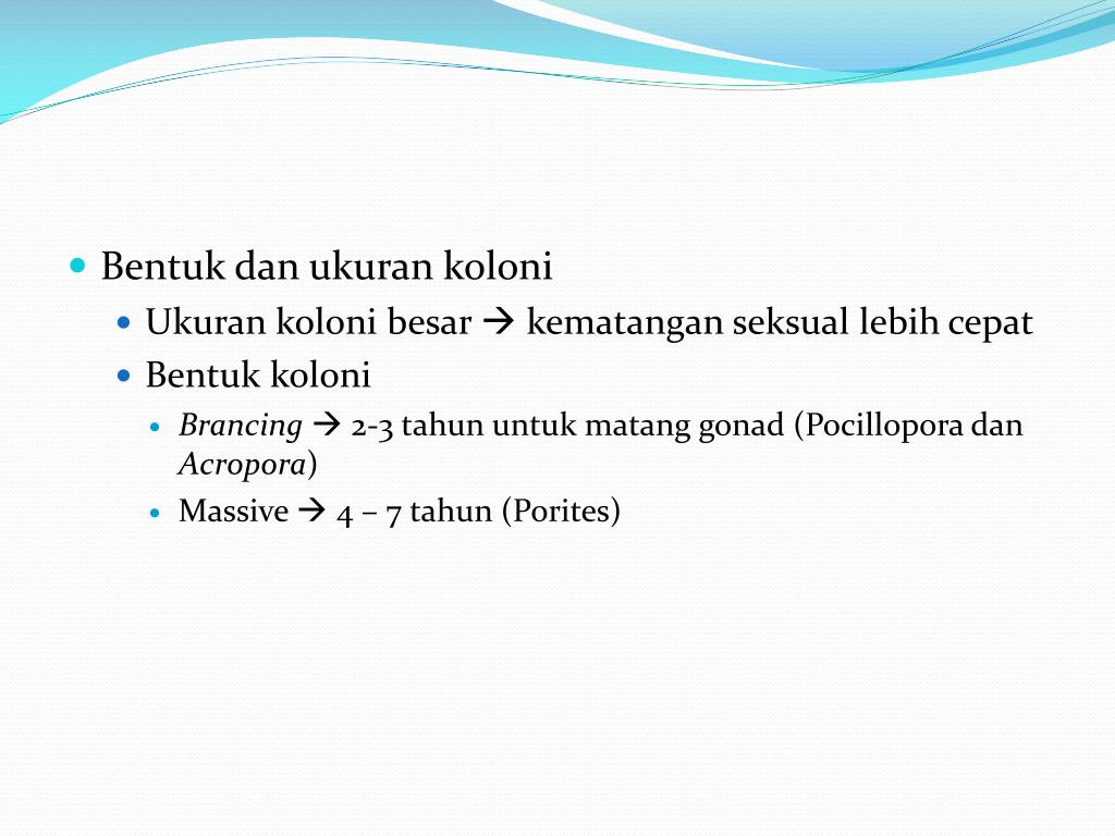 Bentukdanukurankoloni • Ukurankolonibesar kematanganseksuallebihcepat • Bentukkoloni • Brancing 2-3 tahununtukmatang gonad (PocilloporadanAcropora) • Massive 4 – 7 tahun (Porites)