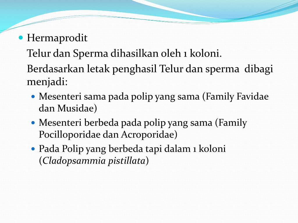 Hermaprodit TelurdanSpermadihasilkanoleh 1 koloni. BerdasarkanletakpenghasilTelurdanspermadibagimenjadi: • Mesenterisamapadapolip yang sama (Family FavidaedanMusidae) • Mesenteriberbedapadapolip yang sama (Family PocilloporidaedanAcroporidae) • PadaPolip yang berbedatapidalam 1 koloni (Cladopsammiapistillata)