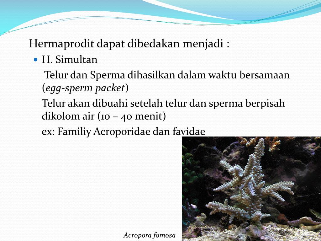 Hermaproditdapatdibedakanmenjadi : • H. Simultan TelurdanSpermadihasilkandalamwaktubersamaan (egg-sperm packet) Telurakandibuahisetelahtelurdanspermaberpisahdikolom air (10 – 40 menit) ex: FamiliyAcroporidaedanfavidae Acroporafomosa