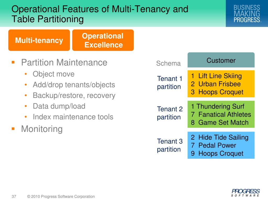 Operational Features of Multi-Tenancy and Table Partitioning Operational Excellence Multi-tenancy • Partition Maintenance • Object move • Add/drop tenants/objects • Backup/restore, recovery • Data dump/load • Index maintenance tools • Monitoring Customer Schema 1 Lift Line Skiing 2 Urban Frisbee 3 Hoops Croquet Tenant 1 partition 1 Thundering Surf 7 Fanatical Athletes 8 Game Set Match Tenant 2 partition 2 Hide Tide Sailing 7 Pedal Power 9 Hoops Croquet Tenant 3 partition