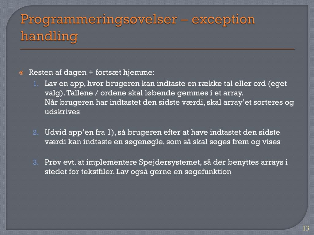 Programmeringsøvelser – exception handling • Resten af dagen + fortsæt hjemme: • Lav en app, hvor brugeren kan indtaste en række tal eller ord (eget valg). Tallene / ordene skal løbende gemmes i et array.Når brugeren har indtastet den sidste værdi, skal array’et sorteres og udskrives • Udvid app’en fra 1), så brugeren efter at have indtastet den sidste værdi kan indtaste en søgenøgle, som så skal søges frem og vises • Prøv evt. at implementere Spejdersystemet, så der benyttes arrays i stedet for tekstfiler. Lav også gerne en søgefunktion