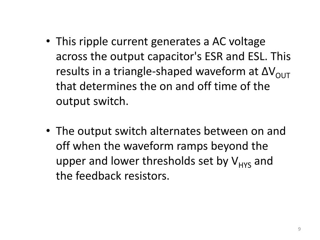 This ripple current generates a AC voltage across the output capacitor's ESR and ESL. This results in a triangle-shaped waveform at ΔVOUT that determines the on and off time of the output switch. • The output switch alternates between on and off when the waveform ramps beyond the upper and lower thresholds set by VHYS and the feedback resistors.