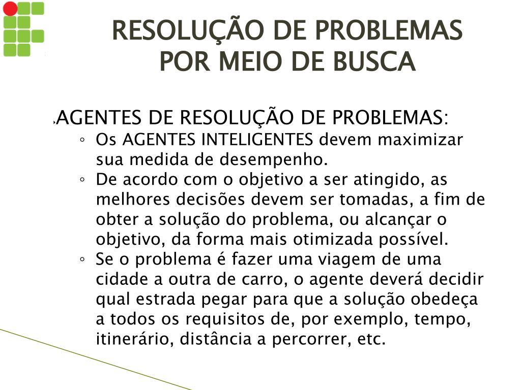 RESOLUÇÃO DE PROBLEMAS POR MEIO DE BUSCA • AGENTES DE RESOLUÇÃO DE PROBLEMAS: • Os AGENTES INTELIGENTES devem maximizar sua medida de desempenho. • De acordo com o objetivo a ser atingido, as melhores decisões devem ser tomadas, a fim de obter a solução do problema, ou alcançar o objetivo, da forma mais otimizada possível. • Se o problema é fazer uma viagem de uma cidade a outra de carro, o agente deverá decidir qual estrada pegar para que a solução obedeça a todos os requisitos de, por exemplo, tempo, itinerário, distância a percorrer, etc.