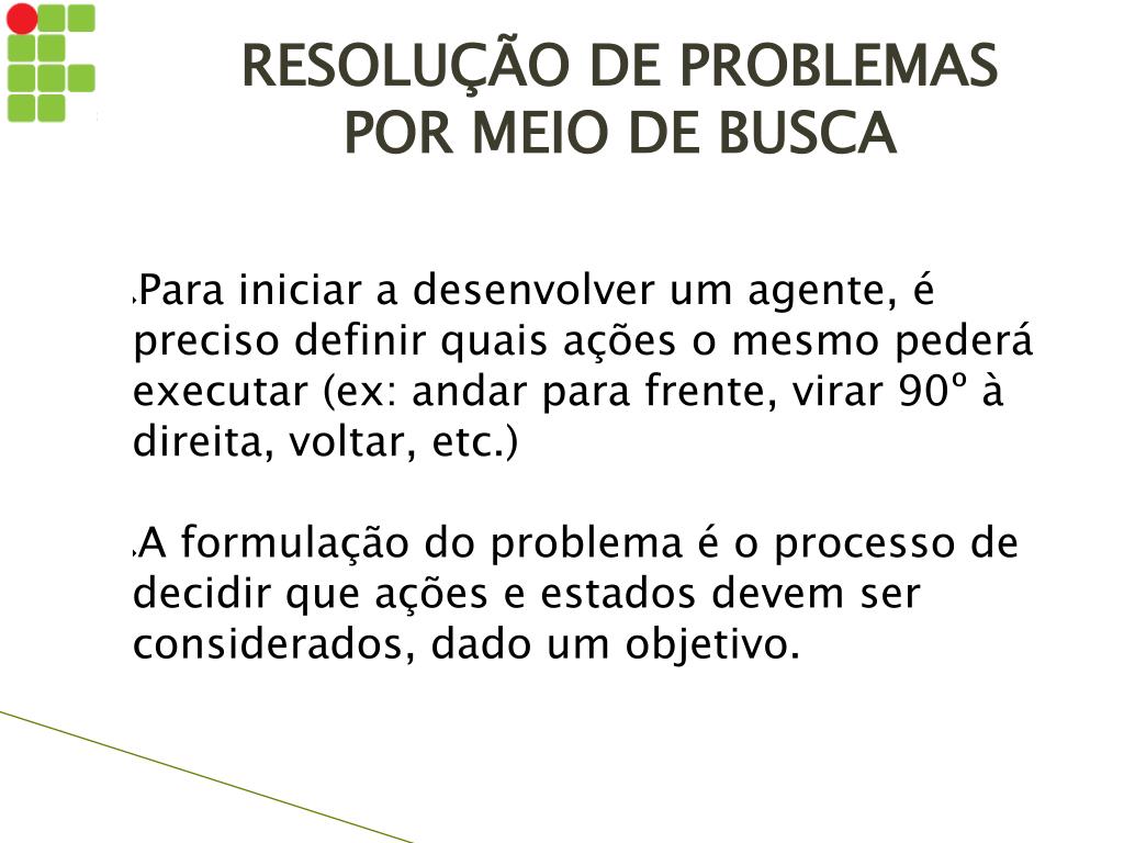 RESOLUÇÃO DE PROBLEMAS POR MEIO DE BUSCA • Para iniciar a desenvolver um agente, é preciso definir quais ações o mesmo pederá executar (ex: andar para frente, virar 90º à direita, voltar, etc.) • A formulação do problema é o processo de decidir que ações e estados devem ser considerados, dado um objetivo.