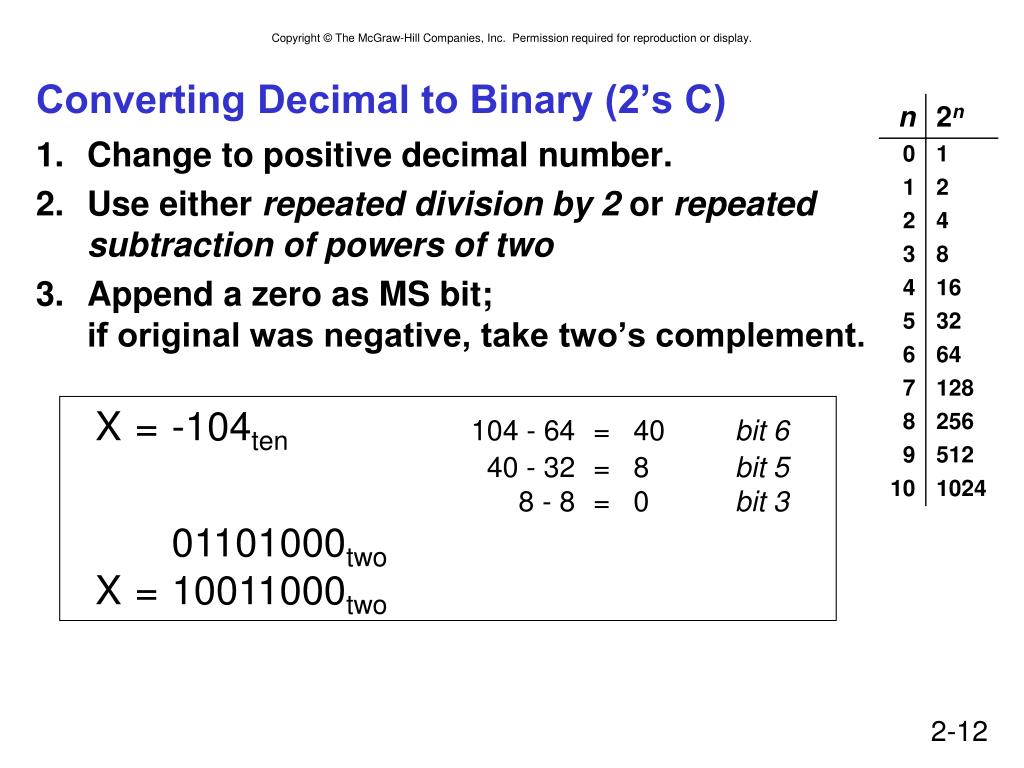 Converting Decimal to Binary (2’s C) • Change to positive decimal number. • Use either repeated division by 2 or repeated subtraction of powers of two • Append a zero as MS bit;if original was negative, take two’s complement. X = -104ten104 - 64 = 40 bit 6 40 - 32 = 8 bit 5 8 - 8 = 0 bit 3 01101000two X = 10011000two
