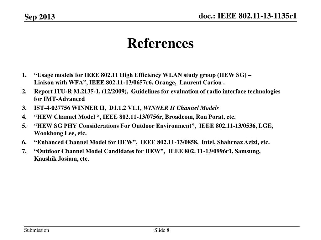 References • “Usage models for IEEE 802.11 High Efficiency WLAN study group (HEW SG) –Liaison with WFA”, IEEE 802.11-13/0657r6, Orange, Laurent Cariou . • Report ITU-R M.2135-1, (12/2009), Guidelines for evaluation of radio interface technologies for IMT-Advanced • IST-4-027756 WINNER II, D1.1.2 V1.1, WINNER II Channel Models • “HEW Channel Model “, IEEE 802.11-13/0756r, Broadcom, Ron Porat, etc. • “HEW SG PHY Considerations For Outdoor Environment”, IEEE 802.11-13/0536, LGE, Wookbong Lee, etc. • “Enhanced Channel Model for HEW”, IEEE 802.11-13/0858, Intel, Shahrnaz Azizi, etc. • “Outdoor Channel Model Candidates for HEW”, IEEE 802. 11-13/0996r1, Samsung, KaushikJosiam, etc.