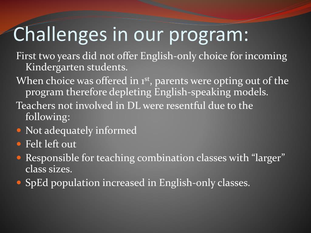 Challenges in our program: First two years did not offer English-only choice for incoming Kindergarten students. When choice was offered in 1st, parents were opting out of the program therefore depleting English-speaking models. Teachers not involved in DL were resentful due to the following: • Not adequately informed • Felt left out • Responsible for teaching combination classes with “larger” class sizes. • SpEd population increased in English-only classes.