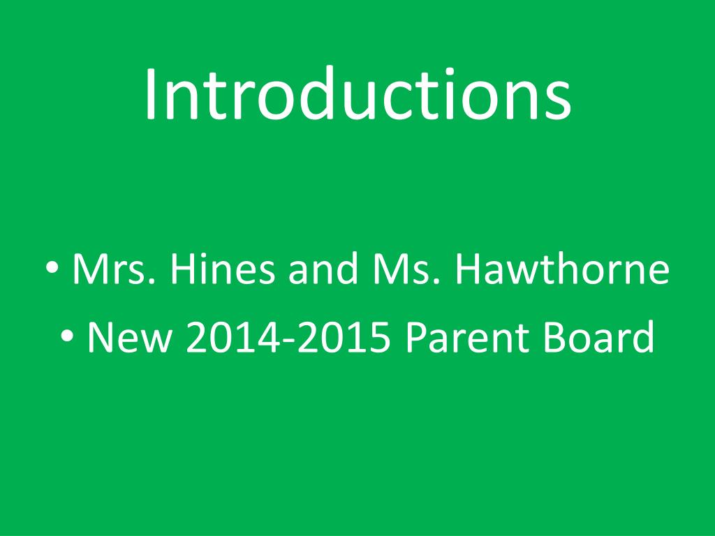 Introductions • Mrs. Hines and Ms. Hawthorne • New 2014-2015 Parent Board