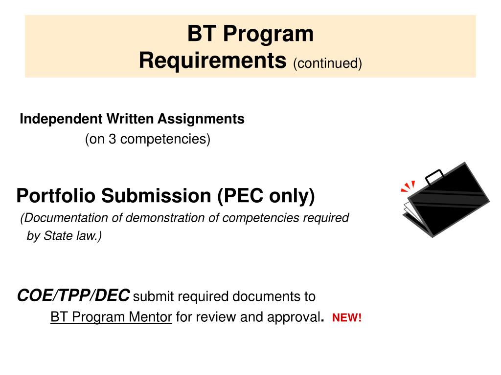 BT Program Requirements (continued) Independent Written Assignments (on 3 competencies) Portfolio Submission (PEC only) (Documentation of demonstration of competencies required by State law.) COE/TPP/DEC submit required documents to BT Program Mentor for review and approval. NEW!