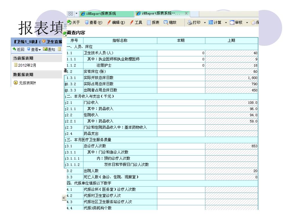 工作前准备 • 上报网址:121.28.24.114/webPage • (注意:P是大写,其他字母小写) • 或:http://121.28.24.114:8080/irpt/i/oem/wsb/login.jsp 用户名称:各单位由卫生局签发的医疗机构许可证前15位 口令:初始口令为123456,必须自行修改为其他口令