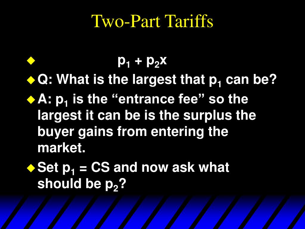 Two-Part Tariffs • p1 + p2x • Q: What is the largest that p1 can be? • A: p1 is the “entrance fee” so the largest it can be is the surplus the buyer gains from entering the market. • Set p1 = CS and now ask what should be p2?