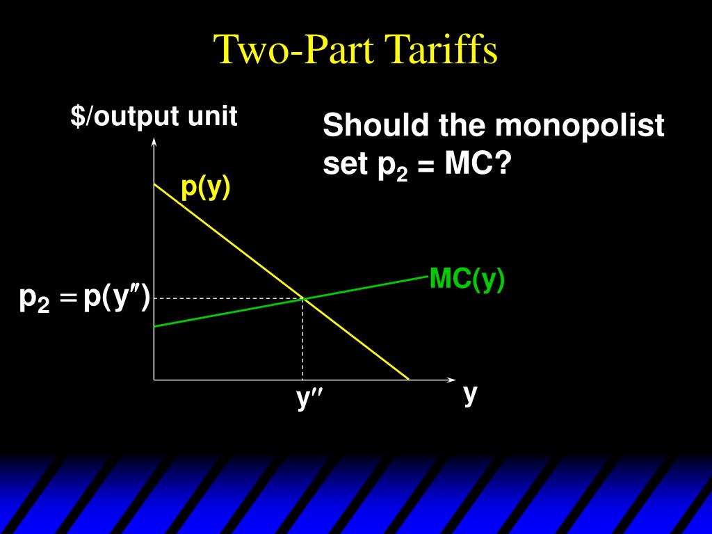 Two-Part Tariffs $/output unit Should the monopolistset p2 = MC? p(y) MC(y) y