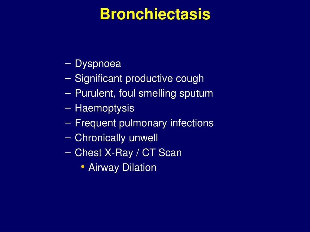 Bronchiectasis Dyspnoea Significant productive cough Purulent, foul smelling sputum Haemoptysis Frequent pulmonary infections Chronically unwell Chest X-Ray / CT Scan Airway Dilation