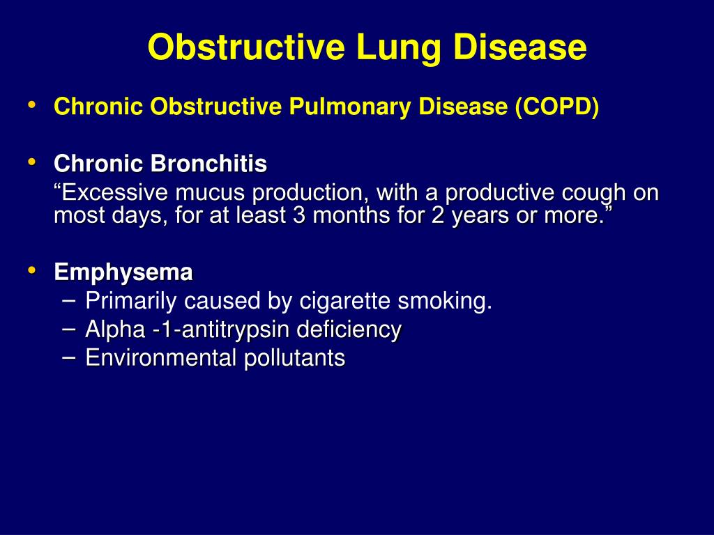 Obstructive Lung Disease Chronic Obstructive Pulmonary Disease (COPD) Chronic Bronchitis “Excessive mucus production, with a productive cough on most days, for at least 3 months for 2 years or more.” Emphysema Primarily caused by cigarette smoking. Alpha -1-antitrypsin deficiency Environmental pollutants