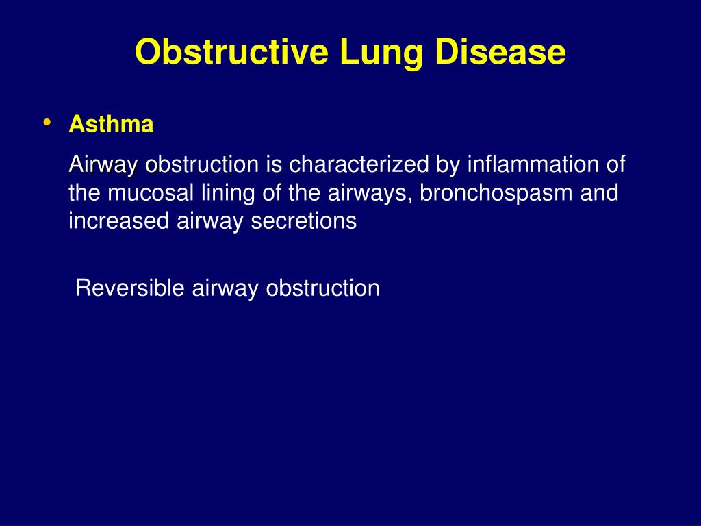 Obstructive Lung Disease Asthma Airway obstruction is characterized by inflammation of the mucosal lining of the airways, bronchospasm and increased airway secretions Reversible airway obstruction