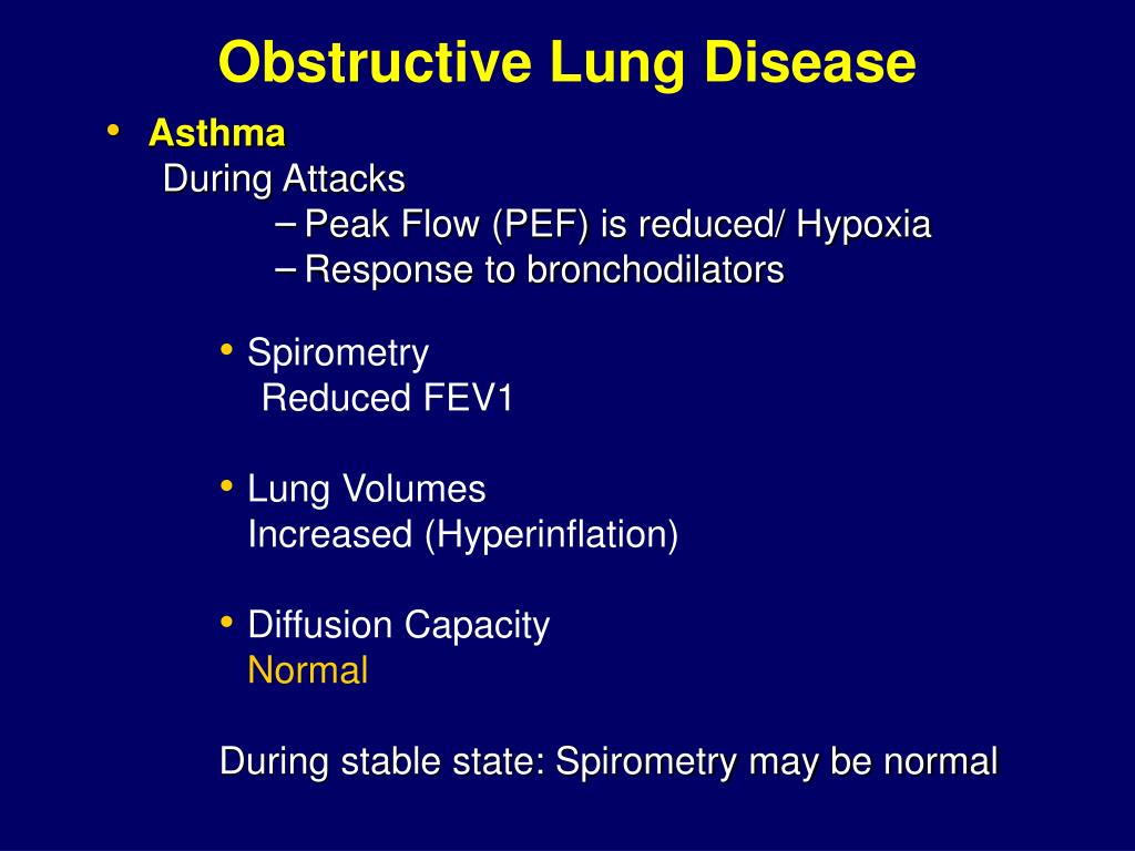 Obstructive Lung Disease Asthma During Attacks Peak Flow (PEF) is reduced/ Hypoxia Response to bronchodilators Spirometry Reduced FEV1 Lung Volumes Increased (Hyperinflation) Diffusion Capacity Normal During stable state: Spirometry may be normal