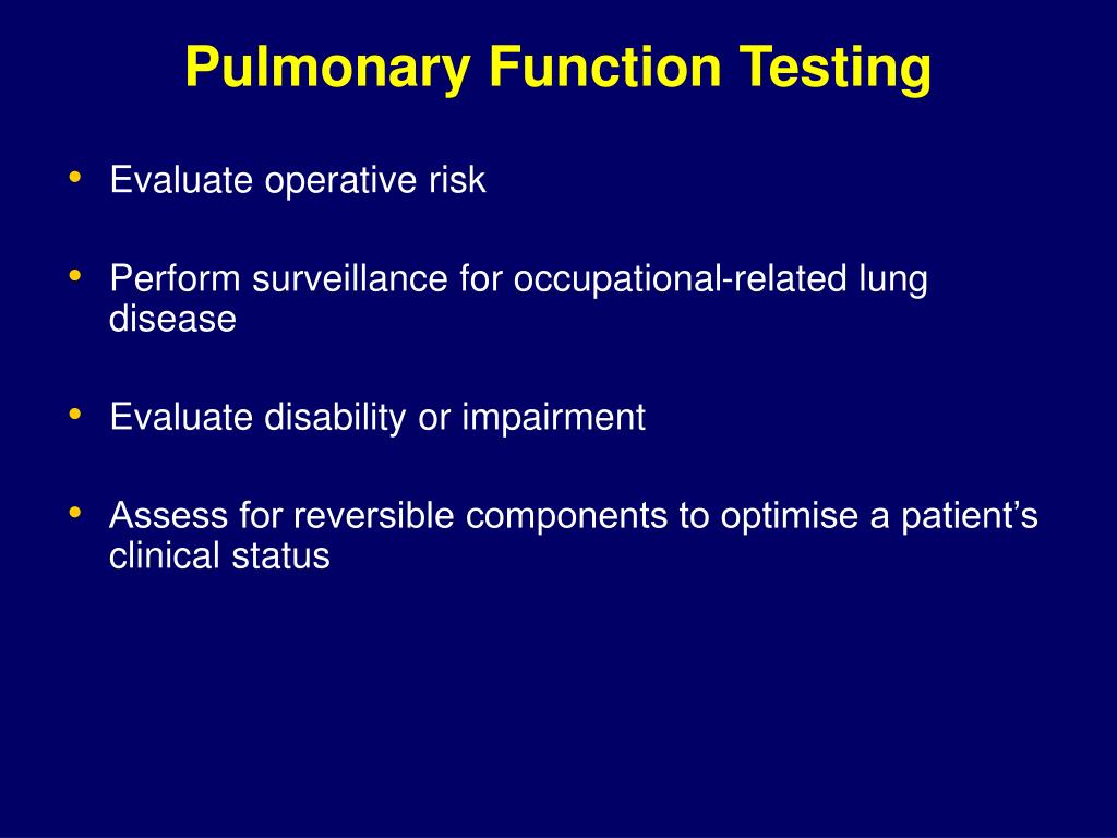 Pulmonary Function Testing • Evaluate operative risk • Perform surveillance for occupational-related lung disease • Evaluate disability or impairment • Assess for reversible components to optimise a patient’s clinical status