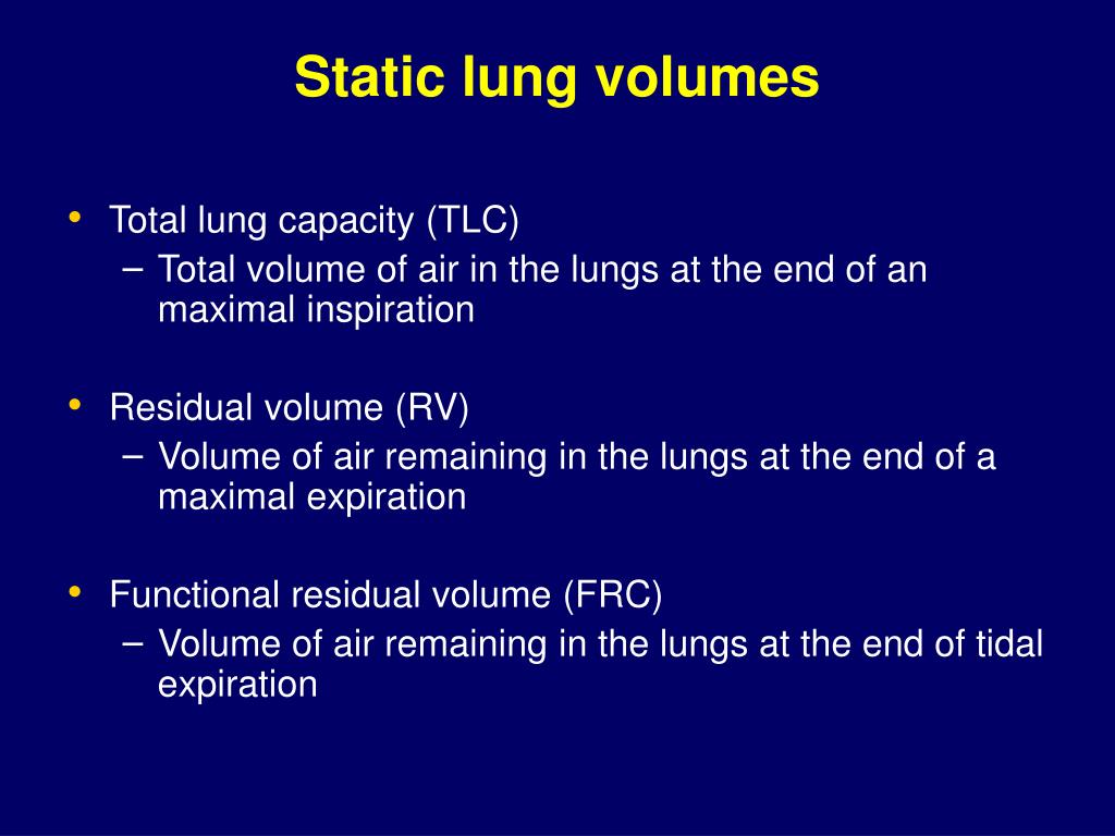 Static lung volumes • Total lung capacity (TLC) • Total volume of air in the lungs at the end of an maximal inspiration • Residual volume (RV) • Volume of air remaining in the lungs at the end of a maximal expiration • Functional residual volume (FRC) • Volume of air remaining in the lungs at the end of tidal expiration