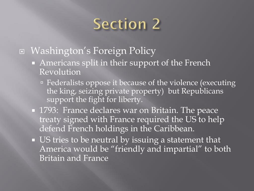 Section 2 • Washington’s Foreign Policy • Americans split in their support of the French Revolution • Federalists oppose it because of the violence (executing the king, seizing private property) but Republicans support the fight for liberty. • 1793: France declares war on Britain. The peace treaty signed with France required the US to help defend French holdings in the Caribbean. • US tries to be neutral by issuing a statement that America would be “friendly and impartial” to both Britain and France