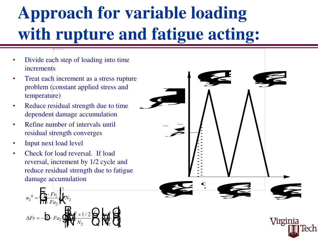 Approach for variable loading with rupture and fatigue acting: • Divide each step of loading into time increments • Treat each increment as a stress rupture problem (constant applied stress and temperature) • Reduce residual strength due to time dependent damage accumulation • Refine number of intervals until residual strength converges • Input next load level • Check for load reversal. If load reversal, increment by 1/2 cycle and reduce residual strength due to fatigue damage accumulation