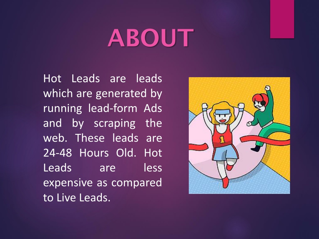 ABOUT Hot Leads are leads which are generated by running lead-form Ads and by scraping the web. These leads are 24-48 Hours Old. Hot Leads are less expensive as compared to Live Leads.