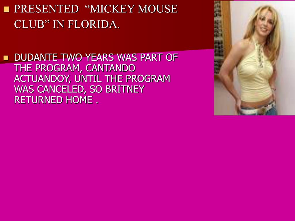 PRESENTED “MICKEY MOUSE CLUB” IN FLORIDA. DUDANTE TWO YEARS WAS PART OF THE PROGRAM, CANTANDO ACTUANDOY, UNTIL THE PROGRAM WAS CANCELED, SO BRITNEY RETURNED HOME .