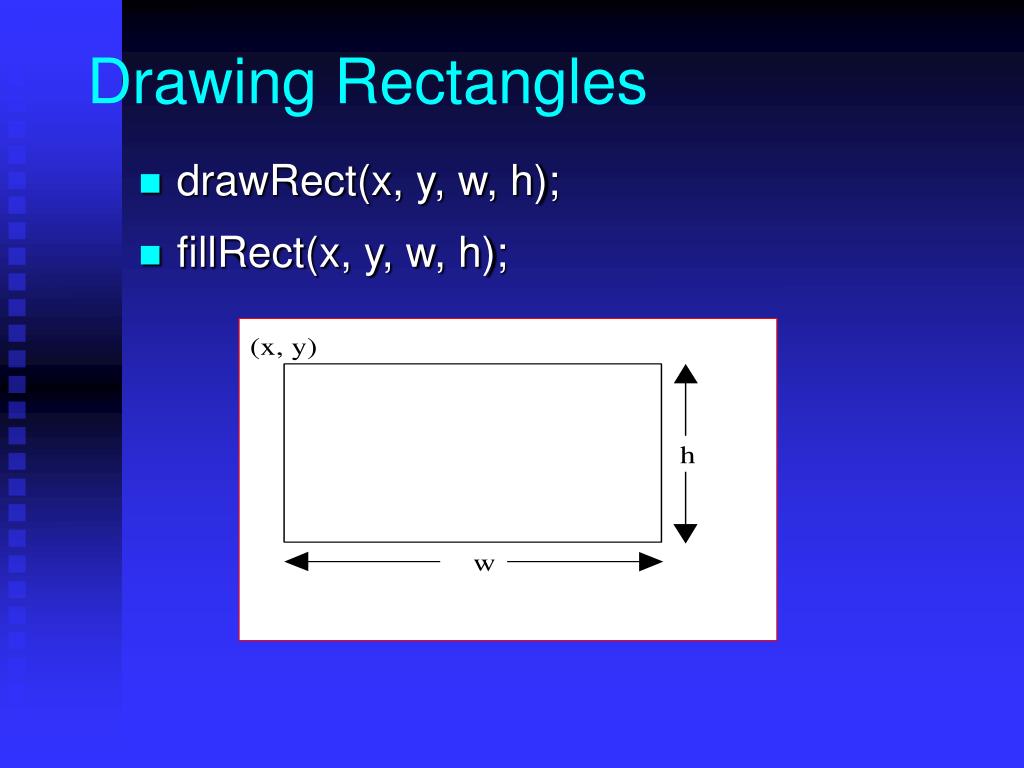 Drawing Rectangles • drawRect(x, y, w, h); • fillRect(x, y, w, h);