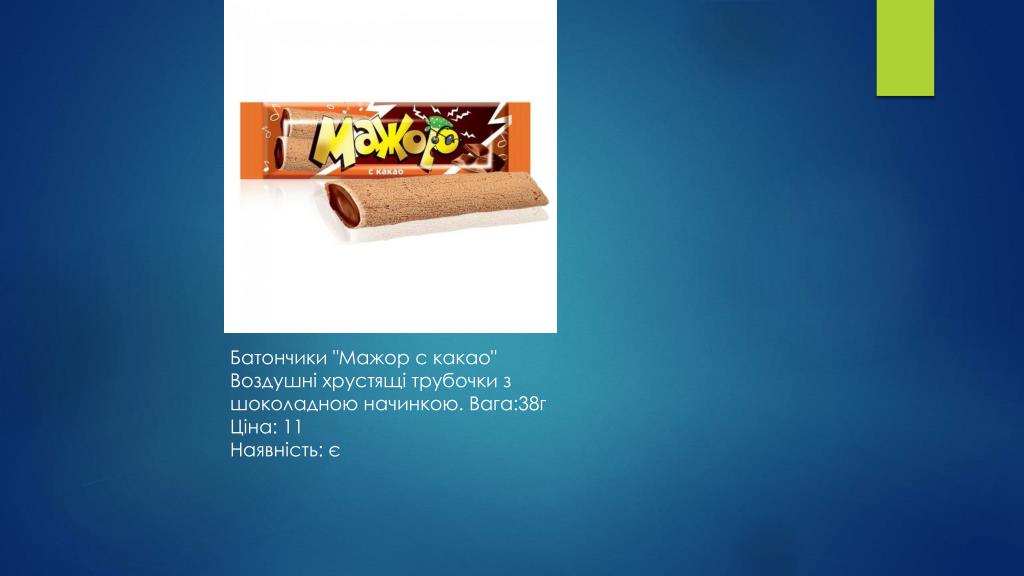 Батончики "Мажор с какао"Воздушніхрустящі трубочки з шоколадною начинкою. Вага:38гЦіна: 11 Наявність: є