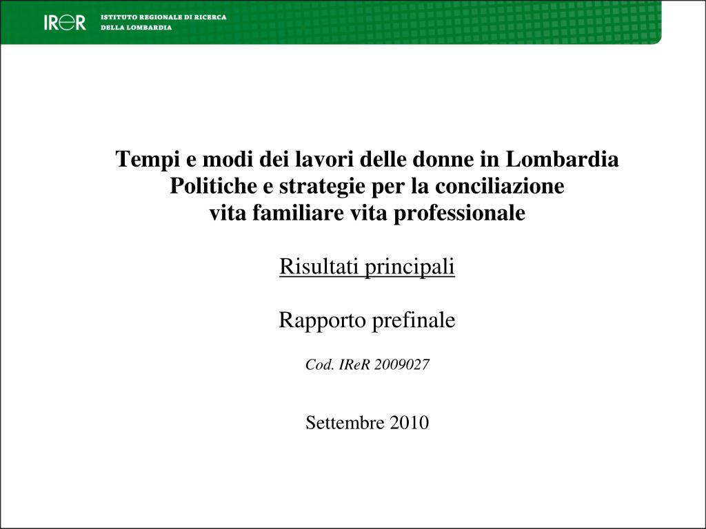 Tempi e modi dei lavori delle donne in LombardiaPolitiche e strategie per la conciliazione vita familiare vita professionaleRisultati principaliRapporto prefinaleCod. IReR 2009027Settembre 2010