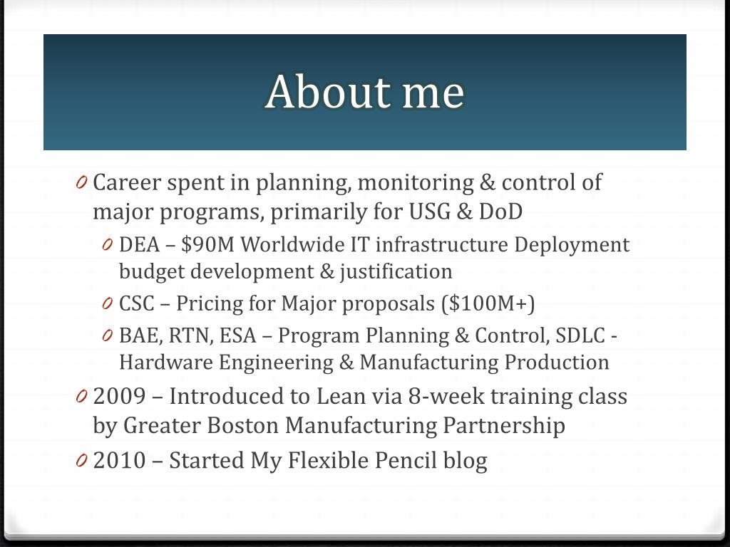 About me • Career spent in planning, monitoring & control of major programs, primarily for USG & DoD • DEA – $90M Worldwide IT infrastructure Deployment budget development & justification • CSC – Pricing for Major proposals ($100M+) • BAE, RTN, ESA – Program Planning & Control, SDLC - Hardware Engineering & Manufacturing Production • 2009 – Introduced to Lean via 8-week training class by Greater Boston Manufacturing Partnership • 2010 – Started My Flexible Pencil blog